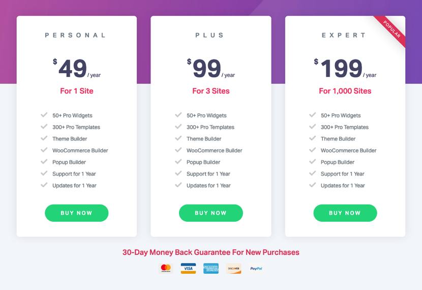 Wählst du zum Beispiel das Personal-Abo aus, bei dem du Elementor für eine einzelne Website nutzen kannst, bezahlst du monatlich $ 5 und damit $ 49 im ganzen Jahr. Umgerechnet sind das rund € 40 bis 45, je nachdem, wie der Wechselkurs aktuell steht.