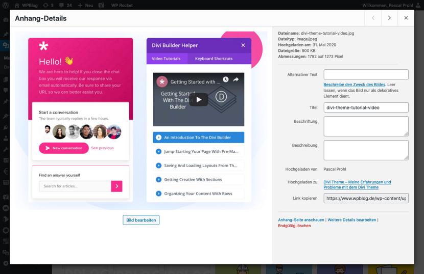 Hast du ein Bild (oder eine andere Datei) hochgeladen, so kannst du dieses in der Übersicht einfach auswählen. Durch einen Klick auf die Datei öffnet sich direkt ein Fenster zur Bearbeitung wichtiger Datei-Eigenschaften. Änderungen, die du hier vornimmst, werden automatisch gespeichert.